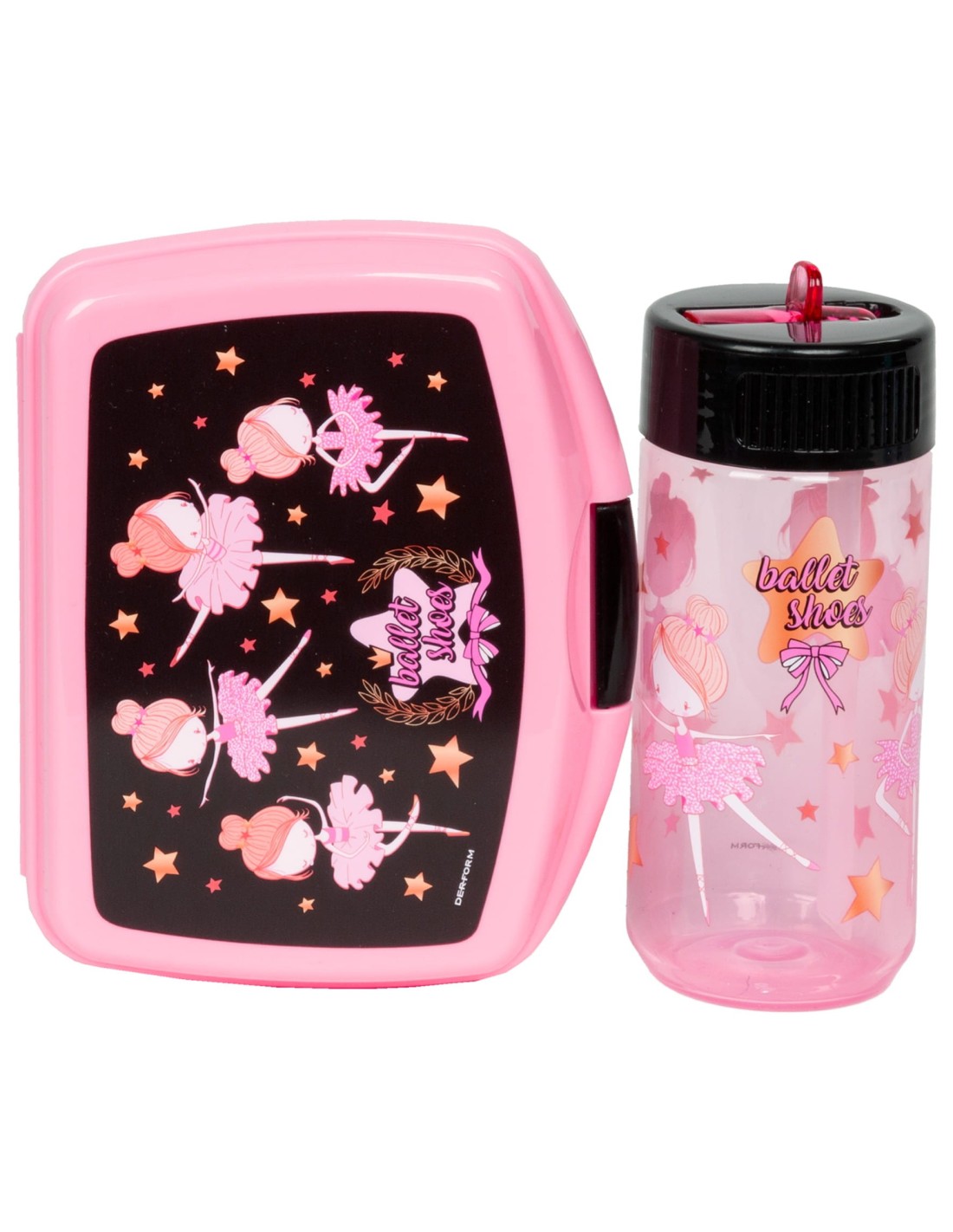 Un set practic cu o sticlă de apă și o cutie de prânz. Indispensabil la școală sau în excursie. Recipientul pentru sandvici este închis cu un zăvor convenabil. Sticla de apa transparenta cu imprimeu, capacitate: 330 ml. Sticla este fabricată din material sigur și rezistent la cădere, fără BPA. Are un muștiuc retractabil și o formă la îndemână perfectă pentru mâna unui copil.