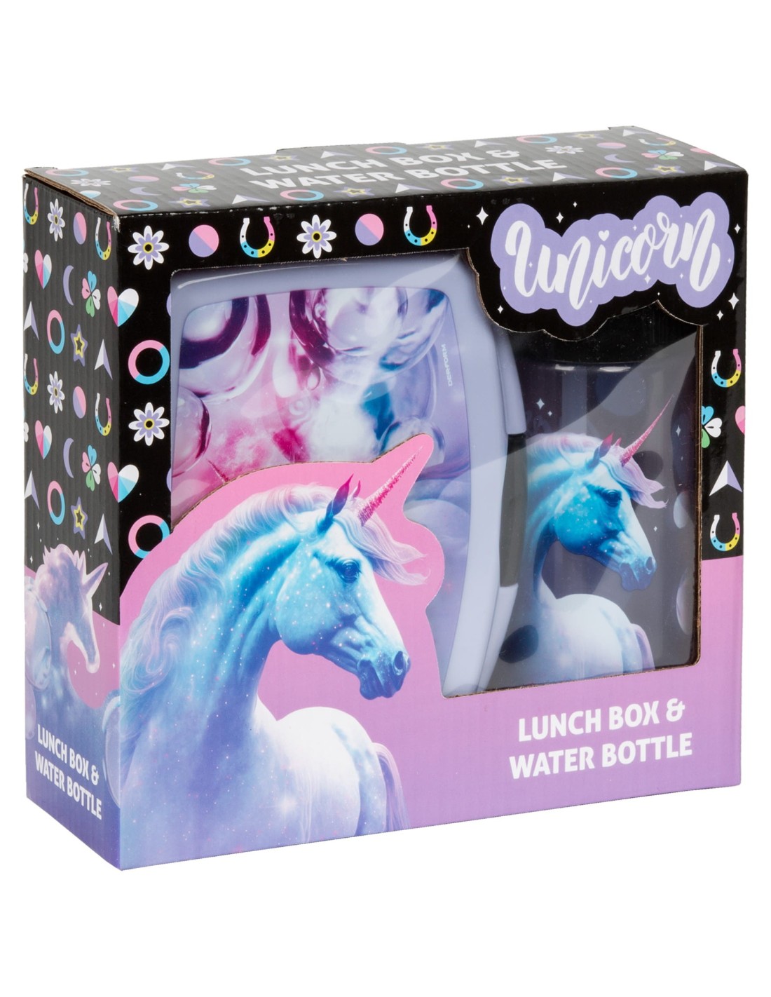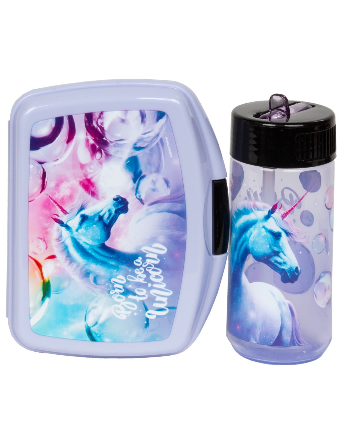 Un set practic cu o sticlă de apă și o cutie de prânz. Indispensabil la școală sau în excursie. Recipientul pentru sandvici este închis cu un zăvor convenabil. Sticla de apa transparenta cu imprimeu, capacitate: 330 ml. Sticla este fabricată din material sigur și rezistent la cădere, fără BPA. Are un muștiuc retractabil și o formă la îndemână perfectă pentru mâna unui copil.